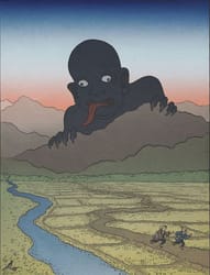 Daidarabotchi are colossal humanoids which resemble bald-headed priests. They have big, rolling eyes, long, lolling tongues, and pitch black skin. They share a lot of similarities with other giants, like ōnyūdō and umi bōzu, but they are by far the largest giants found in yōkai folklore.