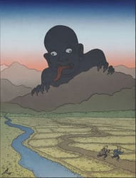 Daidarabotchi are colossal humanoids which resemble bald-headed priests. They have big, rolling eyes, long, lolling tongues, and pitch black skin. They share a lot of similarities with other giants, like ōnyūdō and umi bōzu, but they are by far the largest giants found in yōkai folklore.