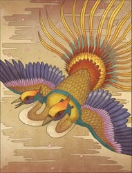 The gumyōchō is a beautiful two-headed bird that resembles a pheasant. Occasionally it is depicted as having two human heads instead of two bird heads. Their home is Gokuraku jōdo, the realm of utter paradise created by Amida Buddha.