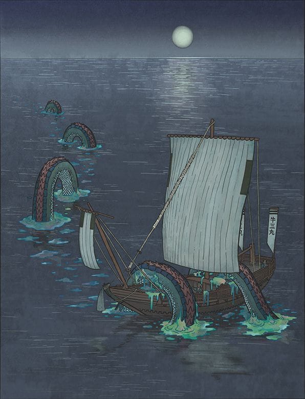 When an ikuchi’s path crosses a boat’s, the sea monster envelopes the boat in its tentacle-like body. It slithers over the sides and across the deck, slowly sliding its whole body over the boat. Ikuchi are so long—many kilometers, by some accounts—that it can take hours for an entire one to slither over a boat. On a few occasions, boats have been tangled up in this monster for days. During this time, sailors must constantly bail the monster’s oily slime off of the deck to avoid being capsized by the heavy goo.