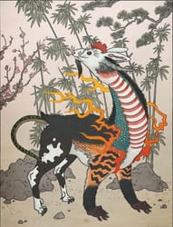 The kotobuki is an auspicious chimera whose body contains parts from all twelve animals of the zodiac. It has the head of a rat, the ears of a hare, the horns of an ox, the comb of a rooster, the beard of a sheep, the mane of a horse, the neck of a dragon, the back of a boar, the shoulders and belly of a tiger, the front legs of a monkey, the rear legs of a dog, and the tail of a snake.