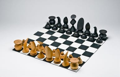 Ernst’s famous chess set is a beautiful balance of hard angles and delicate curves. The design reflects contemporary trends in modernism, particularly as he blended traditional Western chess piece designs with forms derived from African, Oceanic, and Native American art.