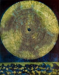 "... created in the year of the first moon landing. Man had conquered the lunar symbol of the yearnings of Romanticism (a cultural epoch so important for Ernst) and found only empty, rocky silence. As if by way of a replacement, Ernst allows a new galaxy, its circular disc patterned with dots, to arise out of the nebula of primeval forms inhabiting the lower border of the picture. This galaxy is located in the imagination – and in the..." http://www.fondationbeyeler.ch/en/collection/max-ernst