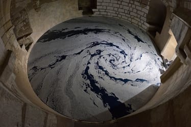 Appearing like swirling clouds or thick ocean foam, Floating Garden is installed in a circular room in a 13th-century medieval castle in Aigues-Mortes, located in the south of France. Without a walkway it is impossible to view the piece up close, viewers only able to view Yamamoto’s labor from afar. (http://www.thisiscolossal.com/2016/05/salt-labyrinths-motoi-yamamoto/)