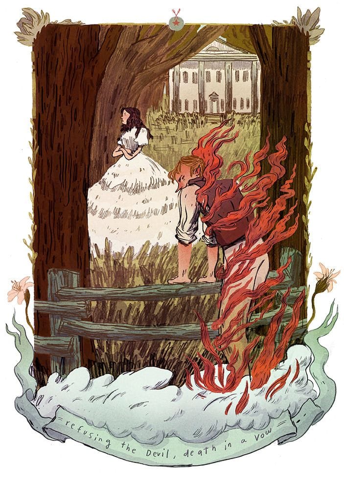 Part of the artist's Senior Thesis at Ringling College. Wild Berries and Oak, a collection of five adaptations of folktales into the Southern Gothic genre. "The Devil's Promise" is based on the Moroccan folktale "Seven Brothers and a Sister."