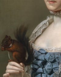 Portrait of Olive Craster (d. 1769), half-length, in a blue dress with ribbons and a lace shawl, with a pearl necklace and flowers in her hair, holding a squirrel, in a feigned oval