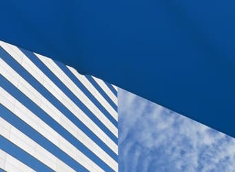 Nestled between the Pacific Ocean and the Ocean Boulevard, the Bank Of America building was expected to have some blue on its facade. In this photograph it is mostly the blue of the clear California sky, as the facade itself is just bright concrete and shiny reflective windows. The blue sky is combined with the blue art display in front of the building, and connected to it only visually. But from under the artistic tarp, the connection with the building and the sky is easily made and captured in slow foot traffic around it.