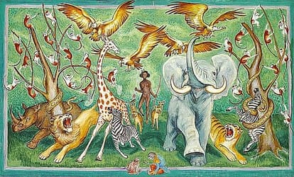 Painted in 1929, Dardel's depiction of this exotic and playful stampede of African jungle animals reflected his training in Paris in the 1910s where he was strongly influenced by the bright colors and naive style of both Matisse and the Fauves and the naive jungle scenes of Henri Rousseau (Le Douanier).