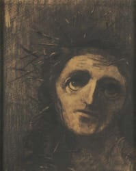 Although he wasn’t a Christian, Redon was attracted to the figure of Christ, especially because of the dual essence ascribed to him: both human and divine. Redon's multiple treatments of Christ crowned with thorns are haunting and mystical in a way that was unprecedented. ...the thorns maintain an active presence. They are not a passive ornament..... The thorns—“glinting like so many blades,”(Heidinger’s words) attack Christ from various angles. The most dynamic element of the portrait, Heidinger notes, is the diagonal that seems to spear the left side of Christ’s forehead and exit underneath his right ear, giving the impression that he is being skewered. ...the eyes are extraordinarily expressive, deep wells of emotion. Here, they gaze upward, not outward. This could indicate a silent plea to the Father to make it stop, or else an anticipation of being reunited with him. (https://artandtheology.org/2016/03/22/christ-crowned-with-thorns-interpreted-by-symbolist-artist-odilon-redon/)