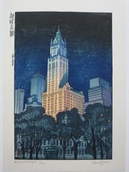 This print, produced on commission by Scholten Japanese Art, is Binnie's most recent addition to his 'Travels with the Master' series. Hiroshi Yoshida (1876-1950) depicted a similar view of the Woolworth Building from City Hall, in a small chuban sized print in 1928. At the time, the Woolworth Building was the tallest building in the world (it would be surpassed in 1930 by 40 Wall Street and the Chrysler Building). As such, it was important to Binnie to capture the building's impressive height, which he accomplished by exaggerating the perspective to emphasize the sensation of looking up at the buildings as they seemed to lean together.
