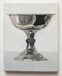 Dreher’s series Silver Bowls (2010- 2012)is a meditation on a silver goblet the artist found on a trip to New York. Dreher’s occupation with time and the subjectivity of visual experience is playfully captured here, once again eliciting profoundness in the abstract reflections of a common object.(http://www.alankoppel.com/exhibitions/peter-dreher-day-by-day-good-day?view=slider#4)