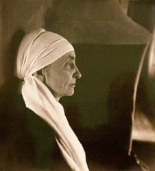 When O’Keeffe removed her hat, Halsman framed a close-up of her scarfed head against a black background. The serious demeanor, the strict profile, and the covered head give this portrait the air of a Renaissance painting of a religious figure.