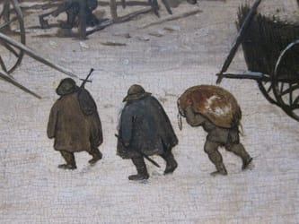 In The Census at Bethlehem, the biblical scene is so completely integrated into Bruegel’s depiction of a Flemish village on a late winter afternoon that you might miss the holy couple on their way to be counted. On the left is the tavern which is serving as the census-taking station. However, what Bruegel has chosen to portray is not enumeration, but rather taxes being paid...