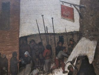 In The Census at Bethlehem, the biblical scene is so completely integrated into Bruegel’s depiction of a Flemish village on a late winter afternoon that you might miss the holy couple on their way to be counted. On the left is the tavern which is serving as the census-taking station. However, what Bruegel has chosen to portray is not enumeration, but rather taxes being paid...