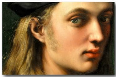 Bindo Altoviti was a rich banker born in Rome in 1491, but of Florentine origin. He was a cultured man who liked the arts.The graceful, almost effeminate position of the subject along with the heavy contrast between light and shadow are atypical of Raphael's work, particularly of his portraits of men, demonstrating the artist's experimentation with different styles and forms in his later Roman period. The influence of the works of Leonardo, which Raphael studied astutely during this period of his career, is strikingly evident in this particular piece.