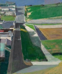 "Diebenkorn painted this suburban California street in 1963, when he moved away from making abstract work and returned to a more representational style, becoming a leading figure of the Bay Area Figurative Movement. Cityscape I suggests that Diebenkorn's essentially abstract, signature style, comprised of large planes of bright color plotted within a grid-like plane, extends even to his figural work." (theartstory.org)