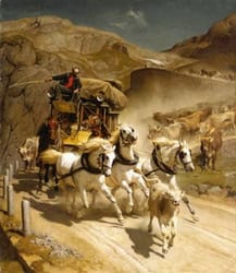 The Gotthardpost, or The St Gotthard Mailcoach, is one of his most famous paintings. It depicts a mail coach, drawn by white horses, speeding along a mountain road. ...In 1870 Koller began to suffer from a vision impairment that interfered with his work. Nevertheless, in 1873, still at the height of his artistic powers, he secured an assignment from the Swiss Northeastern Railway, to produce a gift for the industrial and railway pioneer Alfred Escher on the occasion of his retirement. Koller chose to allude to the St. Gotthard tunnel project, which Escher had championed, and eventually combined several studies to paint the Gotthardpost, or The Gotthard Mail Coach, showing one of the horse-drawn mail coaches, rendered obsolete by the opening of the tunnel. The painting is recognized as one of the best ever done by a Swiss painter. [https://en.wikipedia.org/wiki/Rudolf_Koller]