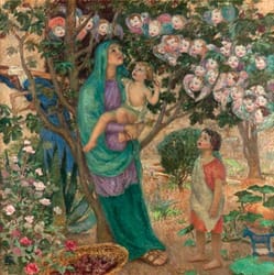 Joseph, the carpenter, is seen only in the background while in the foreground Mary holds baby Jesus, with both appearing to listen to the songs of the cherubim choir in the tree above. At Mary’s feet is a basket of pomegranates. To her right John the Baptist as a child with a toy placed behind him. The painting is loaded with motifs specific to Christianity, but the reading is beguiling – is this a metaphorical scene of hope and renewal, or a contemplation of divinity?