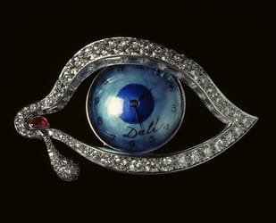 Platinum, diamond, ruby and blue enamel brooch with a mechanical Movado watch movement Conceived in 1949 and executed before 1951 by jewelers Alemany & Ertman, New York. "To history, [the Dalí jewels] will prove that objects of pure beauty, without utility but executed marvelously, were appreciated in a time when the primary emphasis appeared to be upon the utilitarian and the material. [They] were not conceived to rest soullessly in steel vaults. They were created to please the eye..." Dali
