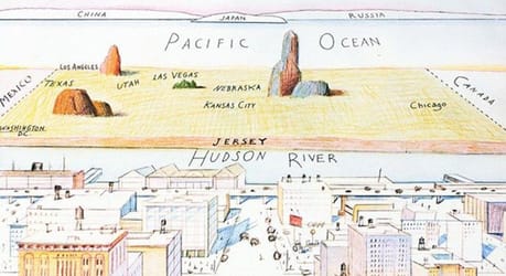 "Saul Steinberg's most popular and enduring drawing is the New Yorker's view of the world, an idea that has been copied many times." http://allthingsruffnerian.blogspot.nl/search/label/Saul%20Steinberg