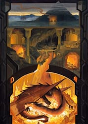 "My depiction of The Lonely Mountain (Erebor), from J. R. R. Tolkien’s The Hobbit. Deep within the dwarven keep lies Smaug the dragon, perched upon his hoard of treasures. The smell of someone unfamiliar rouses him from sleep, but Bilbo stays hidden, watching."