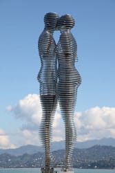 A truly moving sculpture: https://www.youtube.com/watch?v=3ds9fE0tnzE This interpenetration of 2 bodies, masculine and.. (http://www.galeriekornfeld.com/wp-content/uploads/2013/08/Tamara_Kvesitadze-Galerie-Kornfeld-Berlin-2013.pdf) A steel sculpture 8 m (26 ft) high. Located in the seaside town of Batumi, Georgia, the figures represent a Muslim boy, Ali, and a Georgian princess, Nino, from a 1937 novel by Azerbaijani Kurban Said. The tragic story of this novel ends with the separation of the 2 lovers because of the invasion of Soviet Russia. The statues move for 10 minutes every day at 7 pm, merging for a short embrace, before parting back to back. The sculpture was designed in 2007 but installed in 2010; It has since been renamed "Ali and Nino". (http://sphere-emotion.fr/ces-deux-statues-geantes-resument-parfaitement-lamour-entre-un-homme-et-une-femme/) The 7 ton statues are controlled by computer and lit with dramatic color lighting. (https://www.youtube.com/watch?v=3ds9fE0tnzE)