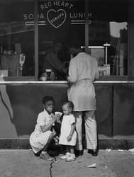 If you study ...125th Street, September, 1946, it won't take you long to spot the key object. The young girl and her baby sister are sharing a snow cone, a paper cup filled with chopped ice and a squirt of fruit syrup. This precursor to water ice became a popular summer treat during the 1930s. But the snow cone isn't what your eyes fix upon. It's the shoes.