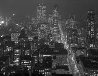 Despite the brilliance of the Sixth Ave photos, Webb came closest to perfection with the close-ups he took of roast peanut sellers, harried pedestrians, little boys petting a cat, a cloth-capped Jewish shop owner on Hester Street. Yet, Webb could not resist the gravity-defying impulse of ascending to the observation deck on the Empire State Building on a clear evening in 1946 to capture spectacular images of the city by night.