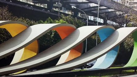 Inaugurated in 1988, it is located in a median strip. There are four 12 meter strips of concrete, in wave form, representing the generations of Japanese who came to Brazil. In 2012, the work gained new colors at the request of the Tomie herself, so that the city gained another novelty. (http://www.brasilpost.com.br/2015/02/12/sao-paulo-tomie-ohtake_n_6671410.html) Monument to Japanese Immigration, 1988. In commemoration of the 80th anniversary of Japanese immigration in Brazil, realized the "waves" of Avenida Vinte e Três de Maio, which are now part of the city's landscape. (http://entretenimento.uol.com.br/album/2013/11/19/conheca-as-principais-obras-da-artista-tomie-ohtake.htm#fotoNav=8)
