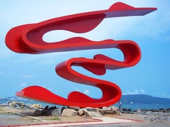 Santos Embarkment 2008 Embarkment at José Menino Beach, Santos, 2008. 15 meter tall steel sculpture, painted with automotive paint, weighs 60 metric tons. Made possible by the city of Santos, sponsored by Cosipa/Usiminas, Gafisa and Yune Incorporadora, with the collaboration of Jorge Utsunomiya and Vera Fujisaki. (http://www.institutotomieohtake.org.br/en/tomie_ohtake/interna/emissario-de-santos)