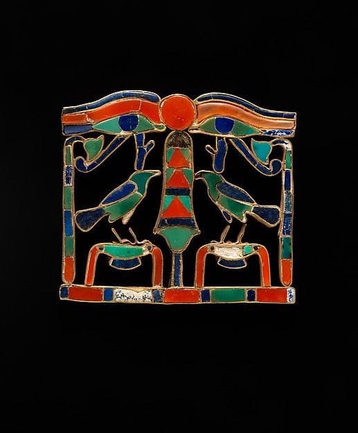 "Pectorals with symmetrical designs, which seem to have arisen in the mid-12th Dynasty, belonged to members of the elite as well as the royal family. At the center of this pectoral is an ukh fetish sacred to the goddess Hathor. It is flanked by 2 birds that sit on hieroglyphs signifying gold. The precise meaning of this combination of elements is uncertain." http://www.metmuseum.org/exhibitions/view?exhibitionId={36BFD863-BD71-4D58-B1B2-F3F865084DBB}&oid=591375&pkgids=331&pg=4&rpp=20&pos=79&ft=*