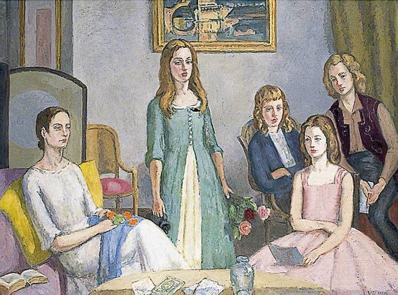 Vanessa Bell and Duncan Grant, between them, turned their affectionate eye on their family. Angelica Garnett, their daughter, was the subject of a series of paintings by her parents that trace her growth from child to adult and mother. Here, Bell, at age 80, painted a group portrait of her daughter and granddaughters with reading materials at hand. (http://books0977.tumblr.com/post/152130590432/angelica-garnett-and-her-four-daughters)