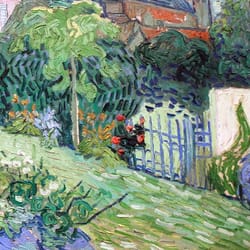 Daubigny’s property included a large garden which Van Gogh would eventually paint a number of times. This impressionistic view depicts only a small part of the enclosure, and is a study for two larger paintings he later made of the whole terrain. He made a little sketch of it for Theo, with a description: “In the foreground green and pink grass […]. In the centre a rose bush, to the right a little gate […] [and] a row of yellow lindens. The house itself is in the background, pink with a roof of bluish tiles.” (http://www.tfsimon.com/auvers-sur-oise.html)