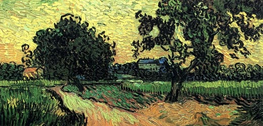 (Alternate title: Landscape with the Chateau of Auvers at Sunset) Painted between June 18 and 22, 1890. ‘A crepuscular effect: two pear-trees, wholly black, against a yellowing sky, with grain-fields; and, in the purple background, the castle, enfolded by dark foliage.’ This was how Van Gogh described his brother Theo in letter 644 (24 or 25 June 1890) the evocative landscape he painted shortly after sunset in the surroundings of the château at Auvers. During the final months of his life, Vincent painted a number of works in this striking format, twice as wide as they were high – ideally suited to broad landscape views. (http://www.tfsimon.com/auvers-sur-oise.html)