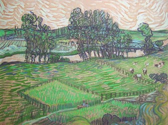 This drawing represents a view looking across the river Oise towards Méry and the Paris road. The view is taken from the top of a high and very steep embankment above a railway line. The old bridge of Auvers (since replaced by a modern structure) is on the right. The plumy forms in the bottom right-hand corner suggest the smoke of a passing train. It would appear that the trees along the riverbank are purely an imaginative addition by the artist. The work has been affected by fading and the colors are no longer as strong as they once were. (http://www.tfsimon.com/auvers-sur-oise.html)