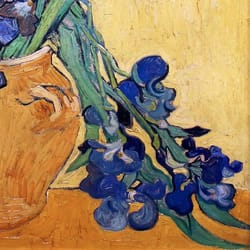 "...I am doing a canvas of roses with a light green back-ground and two canvases representing big bunches of violet irises, one lot against a pink background in which the effect is soft and harmonious because of the combination of greens, pinks, violets. On the other hand, the other violet bunch (ranging from carmine to pure Prussian blue) stands out against a startling citron background, with other yellow tones in the vase and the stand on which it rests, so it is an effect of tremendously disparate complementaries, which strengthen each other by their juxtaposition.