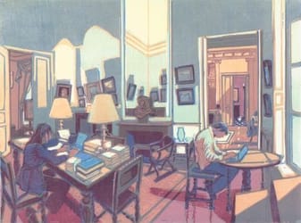 The 18-century Hôtel Turgot in Paris houses the collection (drawings and prints by Rembrandt, Goltzius, correspondence Mondrian, etc. etc.) of art collector Frits Lugt (1884-1970). Wendelien Schönfeld was asked to do a series of color wood cuts of the hotel. In these wood cuts, it is the light that draws your attention. On an almost blinding, just-polished parquet floor. Or between twilight tones in the library. Light falls in this palace as an intruder. Each picture contains several types of light: direct outside light, different kinds of lamp light (A chandelier), skylights ... Wendelien writes that she had only 4.5 days in Paris to make sketches. She had to capture everything. She threw herself into the task almost maniacally. Because, she says, when you work from sketches you "run the risk that the experience fades into the background and you are no longer experiencing the room, but merely redrawing." (Rough translation of http://www.avondlog.nl/tags/wendelien-sch%C3%B6nfeld)