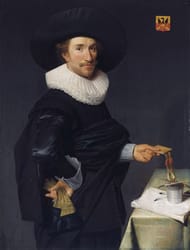 Aa notary in Delft, and was also an important person for the arts in Delft. He also practiced poetry and calligraphy (Wikipedia in Dutch), which probably explains the quills, book and ink.