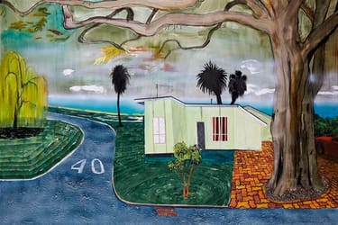 “I really want to get across my experience and the feelings associated with these places,” Mackinnon says. “It’s not really representational of a place; it’s almost more a psychological feeling of going somewhere or leaving.” The works carry with them a sense of nostalgia as Mackinnon is interested in his own personal experiences of the world. He uses the local scenery of places like Lorne where he has had a beach house for 15 years, as a starting point, adding elements from TV and advertising. For example, traveling to Los Angeles influences the work Strange Country. The black silhouettes represent trees as seen from the Eames house looking through to Malibu Beach and the cartoon-like, or collage-looking, trees are inspired by Lorne. “It’s trying to capture the complexity of the experience of all these things – the simultaneity of what it is to be alive,” Mackinnon says. “Although it’s a seemingly beautiful picture, there are rips in the water and the sun is incredibly hot.” Other works such as The Great Indoors (II), Summer in Mullimbimby is a painting of a friend’s house where he has stayed a number of times. “It’s stuff we have an emotional investment in; it’s not an inanimate house.” The image is immediately familiar and captures the essence of summer.