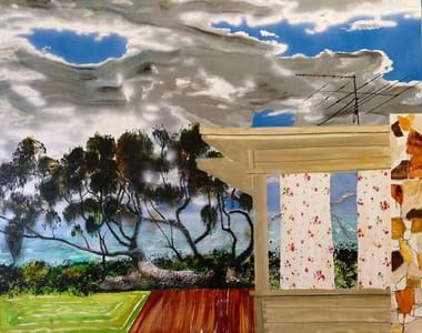 …I have to discover the work as I go. My work contains a human messiness and playfulness as opposed to the clear, tight executed pieces. My paintings are not explictly about any one theme. They are open. I cast a wide net, trying to absorb, to catch the truth of my feeling and experience of our world, of our time, even if I don't consciously understand it. I am more antennae to the world than a separate ego organizing it. I am seeking to be true to my personal experience of being in the world, using what is immediately around me and in my head. Remembering summers past, dreaming of owning a beach shack, longing for change and improvement or getting away. I try to realize its emotional content with formal invention to make paintings that are coarse, funny, nostalgic and powerful. paintings that engage with your mind and your guts. Maybe in 20 years these paintings will be a time capsule of what it's like to be alive now.