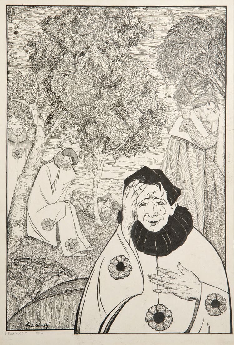I Pagliacci, the earliest known work in ink by Schwartz, is a stylized interpretation of the three-act opera by Ruggero Leoncavallo. While the faces in the tree allude to the suitors of the heroine, Nedda, the hidden imagery was a portent of things to come in Schwartz’s work. In 1917, he graduated from the Art Institute with honors, and remained in good standing with the Institute, having his first solo exhibit there in 1926, with two others to follow. (Yen Azzaro, http://www.afanews.com/articles/item/529-william-s-schwartz-romantic-modernist#.V4TFFa441WZ)