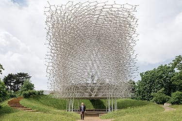 56-Foot-Tall Aluminum Honeycomb Structure Responds to the Buzzing of Bees Within London’s Kew Gardens Forty-four tons of aluminum was just transported and installed at London’s Kew Gardens, a beehive-inspired structure produced by the artist Wolfgang Buttress in partnership with designer and engineer Tristan Simmonds. “The Hive” was originally built as a centerpiece for the UK Pavilion at the Milan Expo 2015 where it won the gold award for architecture and landscape. The installation both aesthetically and symbolically represents its namesake, aiming to demonstrate to visitors the importance of protecting the honeybee. Standing nearly 56-feet-tall the work is located just beyond the gardens’ wildflower meadow, drawing visitors into the structure in the same way worker bees might return back to the hive after a long day of pollinating. In addition to being composed of thousands of pieces of metal, “The Hive” is dotted with hundreds of LED lights that coordinate with a soundtrack of buzzing from within the hive. These elements illuminate and hum in response to real bees housed at Kew, giving visitors a peek into the minute-by-minute energy and mood levels of the gardens’ bees. Berlin-based photographer Dacian Groza was one of the photographers documenting the installation, and took many of the photographs seen here. Educated as an architect, he has a unique eye for the buildings and installations he documents, bringing special attention to timing and composition. You can see more of his architectural images on his website and Instagram. “The Hive” reopened at the Kew Gardens on June 18, 2016 and will be open to the public through November 2017 (http://littlelimpstiff14u2.tumblr.com/post/146031744055/art-sculpture-the-hive-kew-gardens-award-winning-wolfgan)