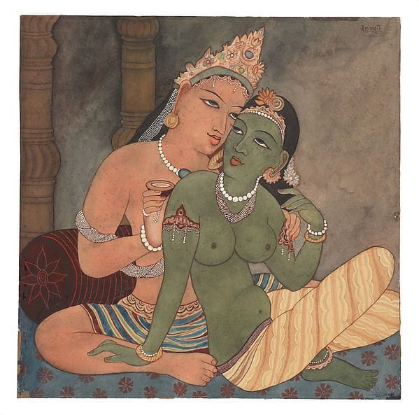 This study of a royal couple is styled after loving couples (mithuna) depicted in courtly scenes in the murals at the Buddhist rock-cut caves of Ajanta, in western India. Here Srimati consciously celebrated that great legacy of sixth-century Indian painting. Contemporary literary sources tell us that the palaces and grand houses of the era were adorned in a similar manner, but it is the murals that survive at Ajanta that best demonstrate the mastery of painting in early India.