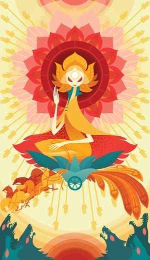 The World for The Fairytale Tarot deck. This is the Legend of Hinemoa, a happy ending after a trial, and the beginning of a new journey. A Maori story, surrounded by Kowhai flowers