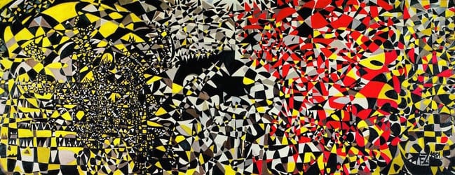 Zeid's monumental painting (more than five metres wide) was produced by tacking the canvas across two walls of her studio. Echoing her deep interest in abstract forms in Islamic art and architecture, she created a vast image of interlocking and undulating black and white shapes, dotted with vibrant red and yellow areas of colour. Describing her painting process, Zeid stated: