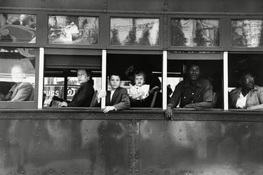 Robert Frank’s book, The Americans, comprised of photos shot between 1955-57, made photographic history: captured on a series of road trips through the US, these images expose the postwar “American way of life” in grim black and white, revealing a reality of pervasive racism, violence, and consumerism. Due to these photos’ failure to uphold America’s self-image at the time, he at first only managed to have this book published in Europe. The Americans contained motifs that, in the midst of the Cold War, had not yet been deemed worthy of depiction. He was interested in everyday phenomena of leisure and pop culture, but also documented isolation, the plights of minorities, and racism: The photograph Trolley, New Orleans was taken just a few weeks before the African-American Rosa Parks refused to give up her seat on a bus in Alabama to a white passenger. It was among 27,000 negatives from 767 rolls of film that Frank chose his... (http://arthistorynewsreport.blogspot.nl/2017/11/)